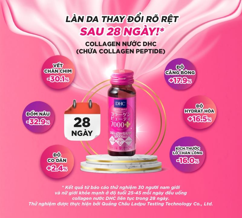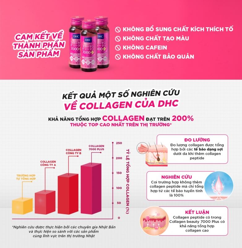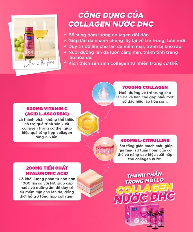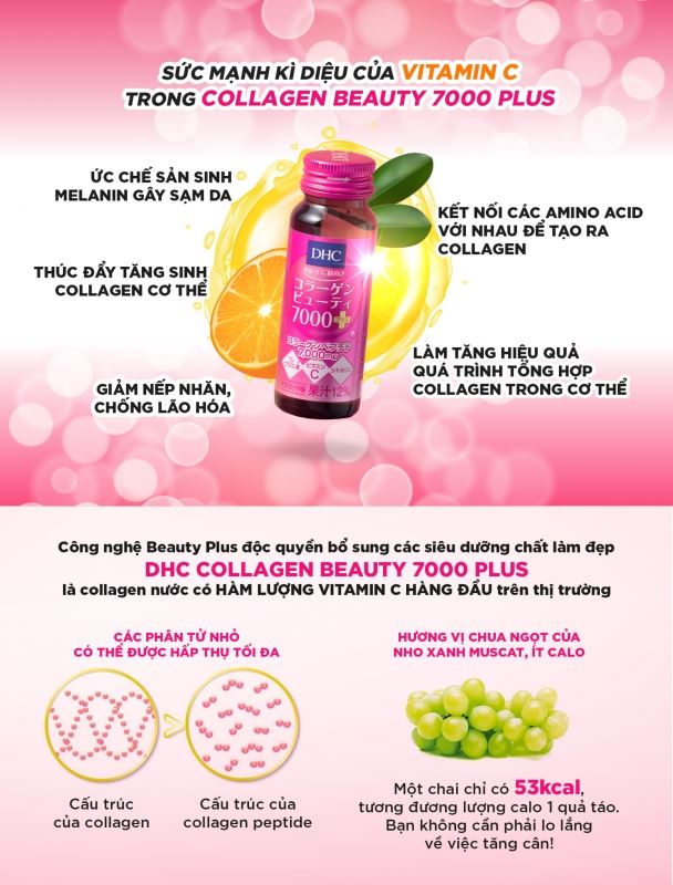 Trải nghiệm hiệu quả làm đẹp thần tốc với DHC Collagen Beauty 7000! Chỉ với 1 lọ collagen dạng nước là bạn đã bổ sung cho cơ thể 7000mg collagen chất lượng cao có cấu tạo dạng peptide với kích thước phân tử siêu nhỏ, giúp cơ thể dễ dàng hấp thụ được tốt nhất.
