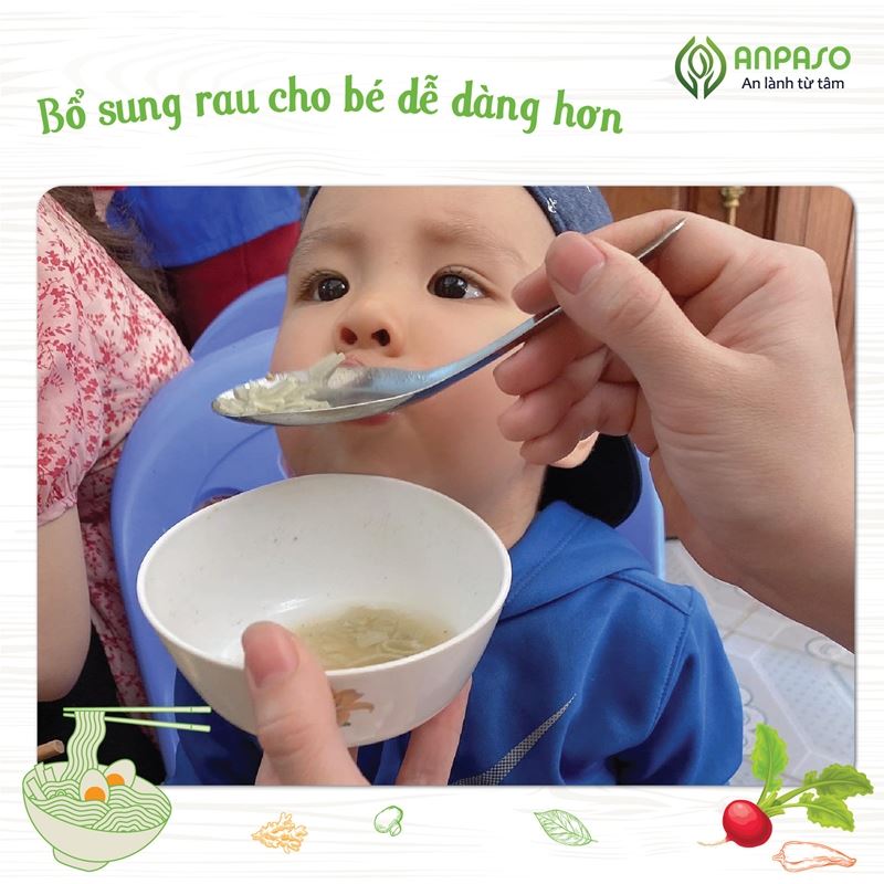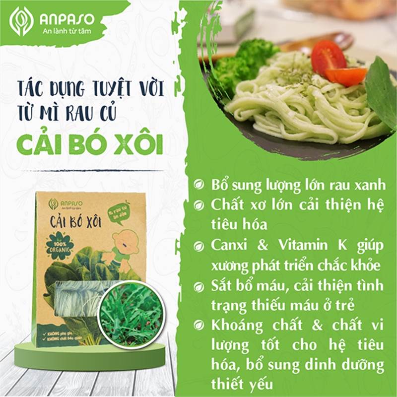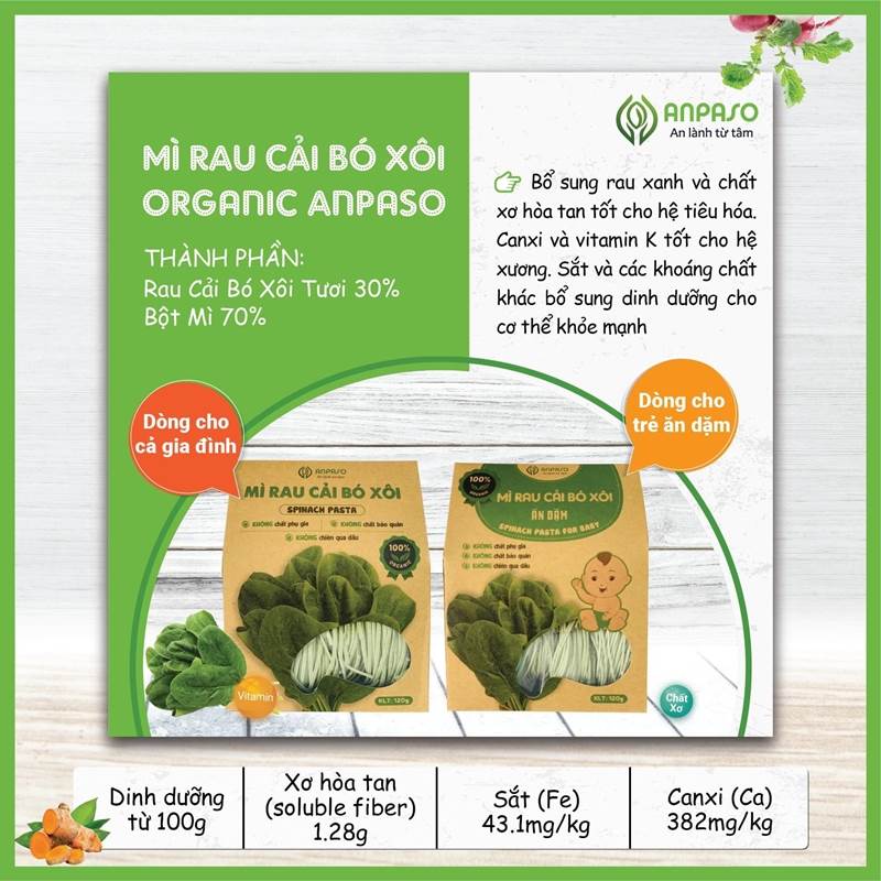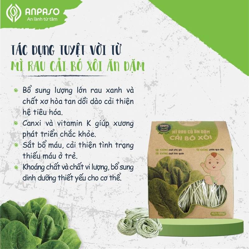 Mì cải bó xôi ăn dặm Anpaso- Cải thiện tiêu hóa, giúp xương chắc khỏeĐôi khi việc tìm kiếm những món ăn giàu dinh dưỡng cho bé trong giai đoạn ăn dặm rất khó khăn. Sản phẩm Mì cải bó xôi ăn dặm đến từ thương hiệu Anpasovới thành phần có nguồn gốc từ vùng đất xanh tươi với công thức bí truyền và sự tư vấn tận tình của các chuyên gia Nhật Bản.