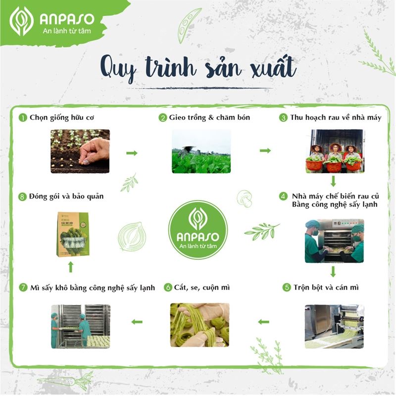 Chặt chẽ từ khâu chọn giống, gieo trồng, thu hái, sản xuất và đóng gói cùng sự cố vấn chuyên môn của các chuyên gia hàng đầu, đặc biệt là chuyên gia đến từ Nhật Bản, Anpasođảm bảo các điều kiện an toàn thực phẩm và cơ sở sản xuất; các tiêu chuẩn về organic, đạt chứng nhận FDA Hoa Kỳ, chứng nhận của OCOP,…