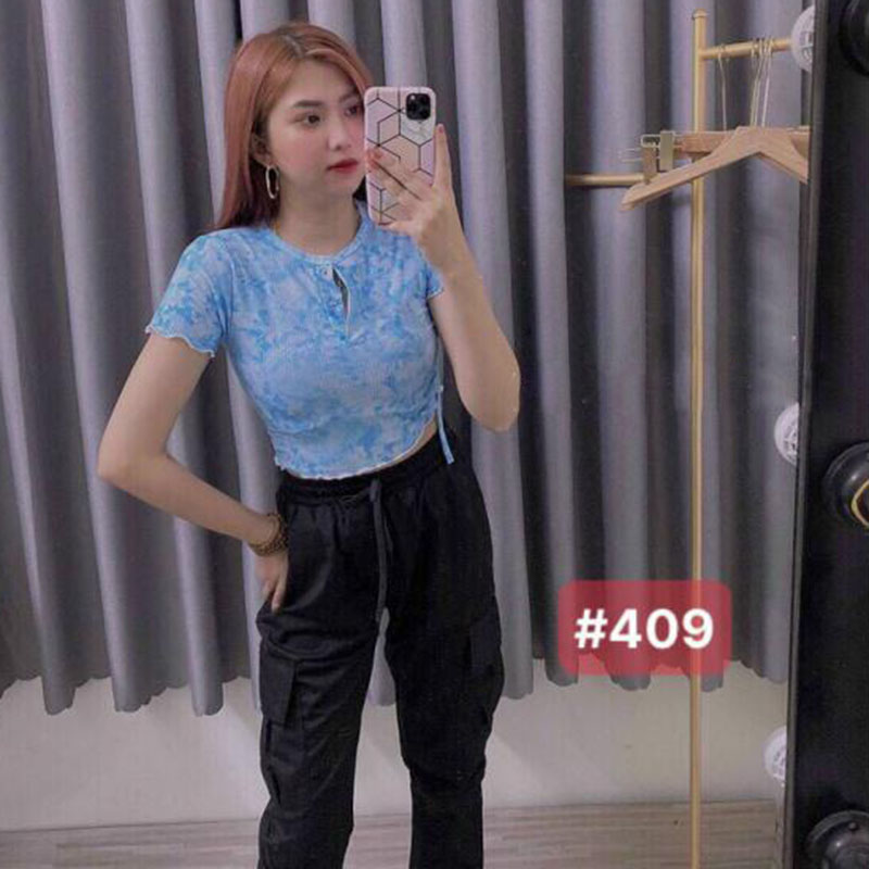 Áo kiểu thun bozip màu loang rút dây 1 bên nút bấm xinh