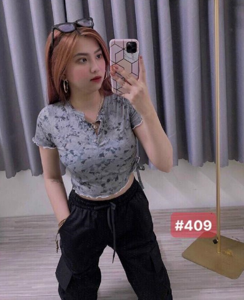 Áo kiểu thun bozip màu loang rút dây 1 bên nút bấm xinh