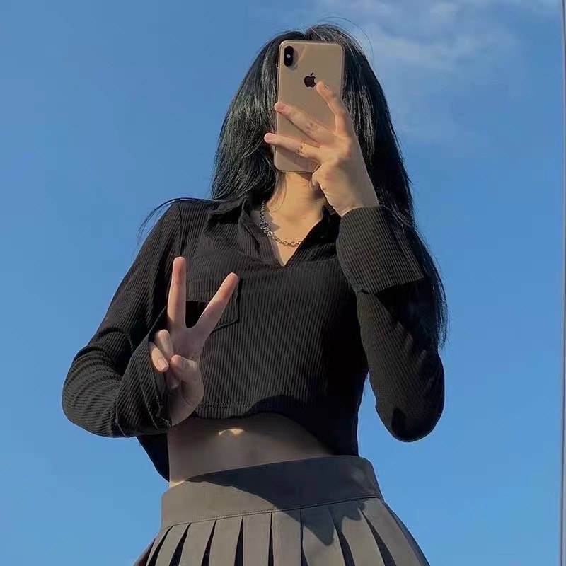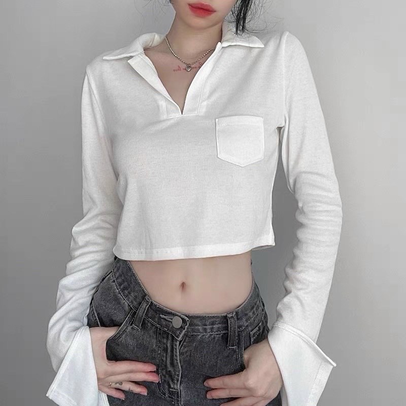 Áo Croptop Nữ Dài Tay Cổ Bẻ Túi Ngực Trơn 2 Màu B037