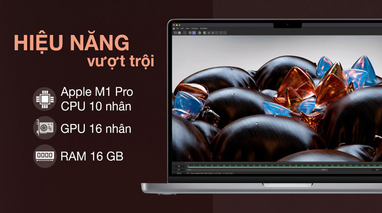 MacBook Pro 16 được trang bị con chip M1 Pro tiên tiến với 10 nhân ( 8 nhân hiệu suất cao + 2 nhân tiết kiệm điện) mang lại hiệu năng mạnh mẽ. Con chip này được sản xuất dựa trên tiến trình 5 nm, có đến 33.7 tỷ bóng bán dẫn, tốc độ băng thông lên đến 200GB/s memory bandwidth mang đến hiệu suất nhanh hơn tới 70% so với M1. Theo đó, có thể giải quyết tốt các công việc văn phòng từ cơ bản đến phức tạp trên các phần mềm Office 365 hay các tác vụ đồ họa chuyên nghiệp trên Photoshop, AI, Pr, AutoCAD,…