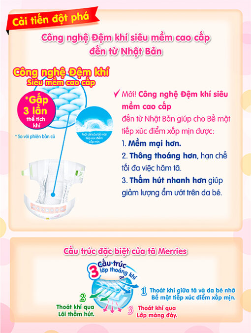 – Ưu điểm của tã Merries là có lõi thấm kép bằng bông cùng với nhiều hạt siêu thấm li ti có chức năng thấm nhanh và khóa chặt chất lỏng, không cho nước tiểu thẩm ngược lên da giúp cho bé luôn có cảm giác khô thoáng trong suốt cả ngày.