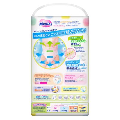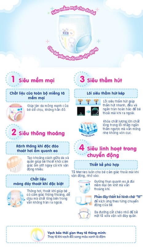 – Đối với loại tã quần Merries, rãnh thông khí độc đáo thoát hơi ẩm quanh eo đặc biệt giúp tạo khoảng cách giữa da và quần giúp bé thoát khỏi cảm giác ẩm ướt ngay cả khi vận động nhiều.