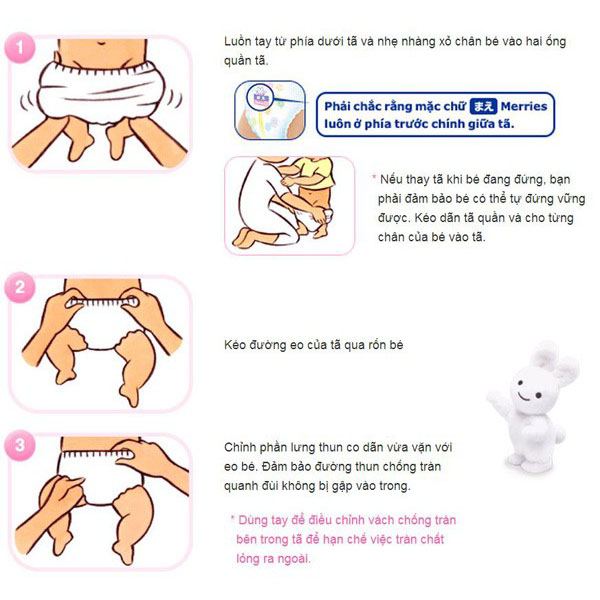 – Với tã quần Merries: Bạn nhẹ nhàng cho 2 tay xuống dưới tã, sau đó thực hiện động tác cho 2 chân bé luồn vào trong của 2 ống tã. Bạn hãy chắc chắn rằng ở mặt trước bỉm quần Merries, chữ Merries luôn phải nằm ở chính giữa tã để tránh trường hợp chiếc tã của bạn bị xô lệch.