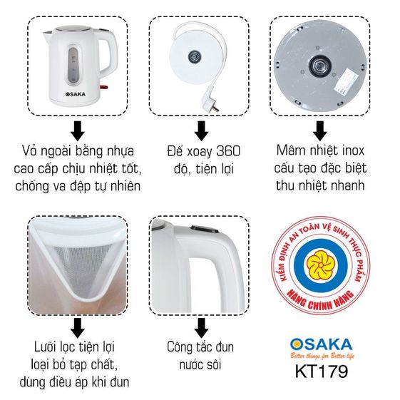 Bình đun siêu tốc KT179 – Osaka giúp đun sôi nước, pha trà, pha cafe, nấu mì ăn liền, pha sữa, khử trùng đồ vật trẻ em.