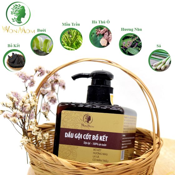 Dầu gội cốt bồ kết Wonmom gồm những thành phần tự nhiên, an toàn: Bồ kết, bưởi, mần trầu, hà thủ ô, hương nhu, sả giúp da đầu trở nên chắc khỏe, giảm rụng tóc, kháng viêm, chống nhiễm khuẩn và tẩy sạch đặc biệt là trị nấm da đầu.