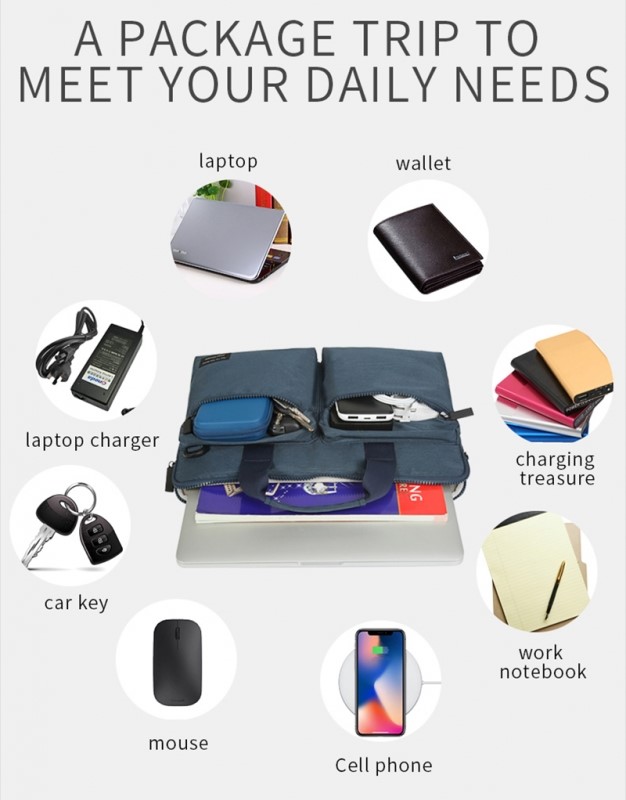 Tất cả vật dụng cần thiết được gói gọn trong một chiếc túi như: Laptop, Sạc, Chuột, Điện Thoại, Ví, Sổ Tay,…