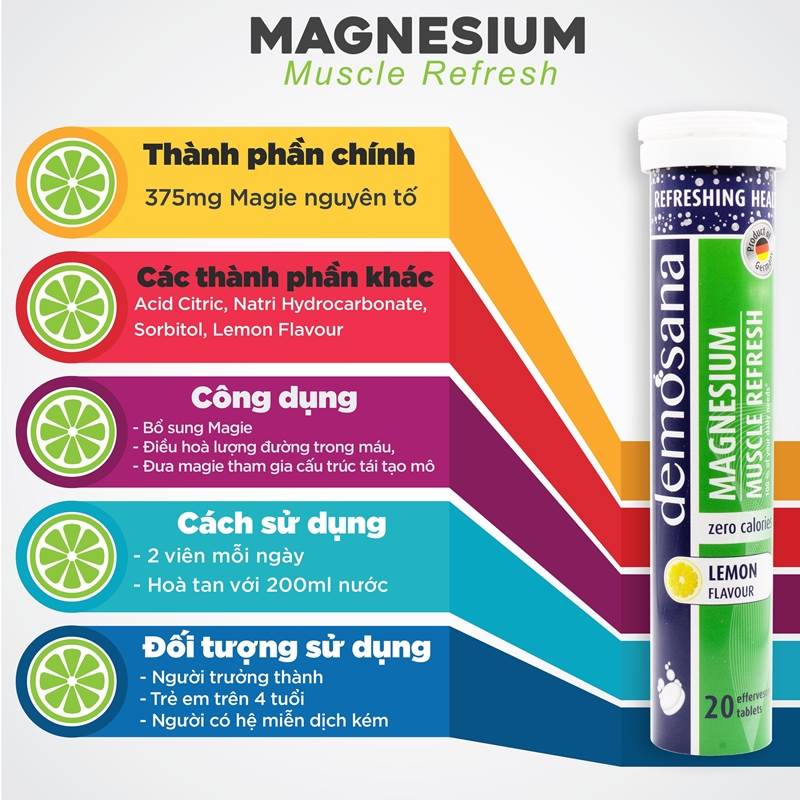 Thành phần của viên sủi bổ sung nguyên tố Magie Demosanavị chanh 20 viên