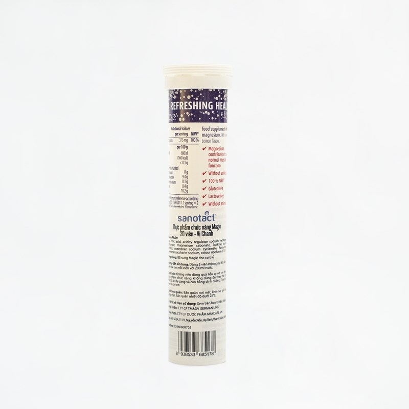 Đối với thân thể con người, Magie là loại khoáng chất hay một nguyên tố vi lượng quan trọng và cần thiết đối với vận hành thân thể. Chúng tham gia vào rất nhiều quá trình của thân thể bao gồm hoạt động cơ bắp và dây thần kinh, tim khỏe mạnh, xương khớp tăng trưởng bình thường, giữ cho lượng đường trong máu bình thường,… Nhu cầu Magie với một người trưởng thành là khoảng 350-400mg/ngày. Đối với những người thường xuyên làm việc nặng nhọc, vận động viên, người tập luyện thể thao sẽ thường cao hơn từ 1.5 đến 2 lần. Ngược lại trẻ em sẽ cần ít hơn(6 tháng tuổi: 30mg; 1 – 3 tuổi: 80mg; 9 – 13 tuổi: 240mg Magie/ngày). Trường hợp thân thể thiếu Magie gây nên nguy cơ tăng huyết áp, vôi hóa động mạch, gián đoạn giấc ngủ, lo lắng trầm cảm, ảnh hưởng xương cốt,… Lúc này, việc bổ sung Magie là vô cùng cần thiết. Dòng sản phẩm viên sủi bổ sung nguyên tố Magie Demosanavị chanh 20 viên có tác dụng bổ cung cấp và bổ sung 375mg Magie trong 1 viên uống, cung cấp lượng cần thiết cho thân thể trong 1 ngày. Đặc biệt hơn, sản phẩm được sản xuất theo khoa học cao tiên tiến, không đường, không gluten, không calo, không lactose, không thành phần từ động vật, hoàn toàn an toàn và có thể sử dụng cho những người tiểu đường hay người đang giảm cân. Thiết kế lọ đựng 20 viên dạng sủi dễ sử dụng, tiện lợi và có vị chanh nhẹ nhàng, dễ uống.