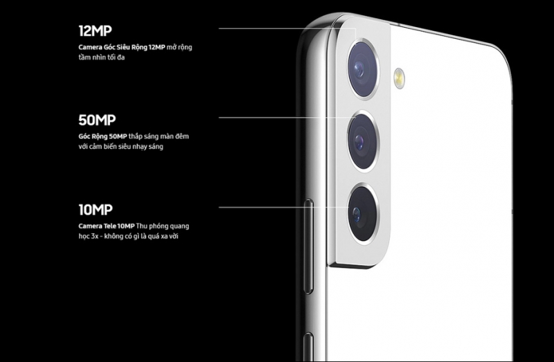 Về phần nhiếp ảnh, Galaxy S22 5G vẫn sở hữu hệ thống 3 camera sau được xếp theo chiều dọc. Trong đó, bao gồm cảm biến chính có độ phân giải 50MP, khẩu độ f/1.8, tương trợ Dual Pixel AF trang bị công nghệ chống rung quang học OIS. Còn lại là ống kính 12MP, khẩu độ f/2.2 cho góc chụp siêu rộng và camera tele 10MP có khẩu độ f/2.4, tương trợ OIS, zoom quang học 3x và zoom kỹ thuật số 30x.