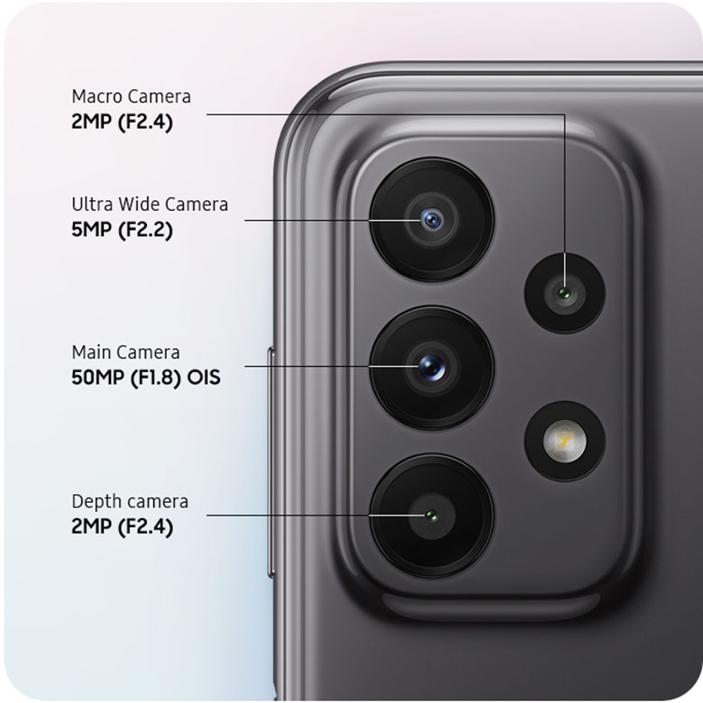 Cụm camera của Galaxy A23 có 4 ống kính, trong đó camera chính cảm biến 50MP F1.8, camera phụ góc siêu rộng 5MP F2.2, camera macro 2MP và camera đo chiều sâu 2MP đi kèm với đó là nhiều tính năng chụp ảnh chuyên nghiệp giúp bạn thỏa sức khám phá và tạo dấu ấn của riêng mình trong mỗi khoảnh khắc.