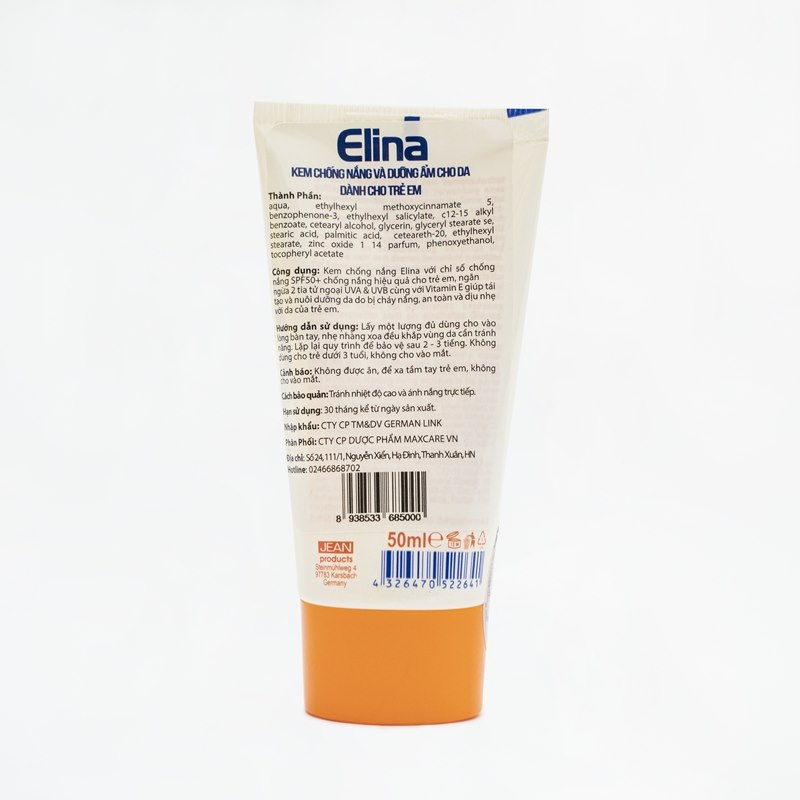 Chống nắng càng sớm thì hiệu quả bảo vệ làn da và ngăn ngừa các tác nhân gây lão hóa càng cao. Vậy nên hãy bảo vệ con bạn và tập cho trẻ thói quen bảo vệ da từ sớm để duy trì làn da trắng khỏe nhé. Sản phẩm Elina Med Sun Sonnen CrèmeKids là kem chống nắng và dưỡng ẩm cho da, dành cho trẻ em với chỉ số chống nắng SPF 50 chống nắng hiệu quả cho trẻ em, ngăn ngừa 2 tia tử ngoại UVA & UVB cùng với Vitamin E giúp tái tạo và nuôi dưỡng da do bị cháy nắng, an toàn và dịu nhẹ với da của trẻ em. Sản phẩm không thấm nước và dễ rửa trôi phù hợp với các hoạt động vui chơi, bơi lội ngoài trời cho bé. Elina Med Sun Sonnen CrèmeKids đặc biệt phù hợp chăm sóc làn da nhạy cảm của trẻ em. Bảo vệ da bé khỏi tác hại của các tia bức xạ nguy hiểm UVA/UVB. Kem chống nắng Cung cấp độ ẩm cho da lên đến 24h, giúp da không bị khô, mất nước. An toàn trên mọi loại da, kể cả da nhạy cảm.