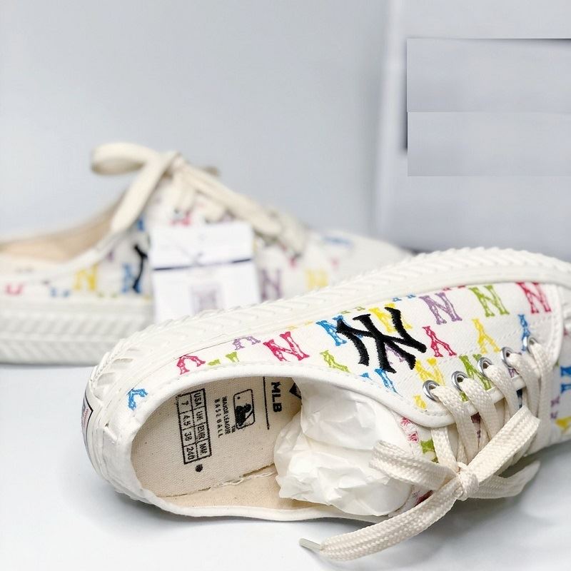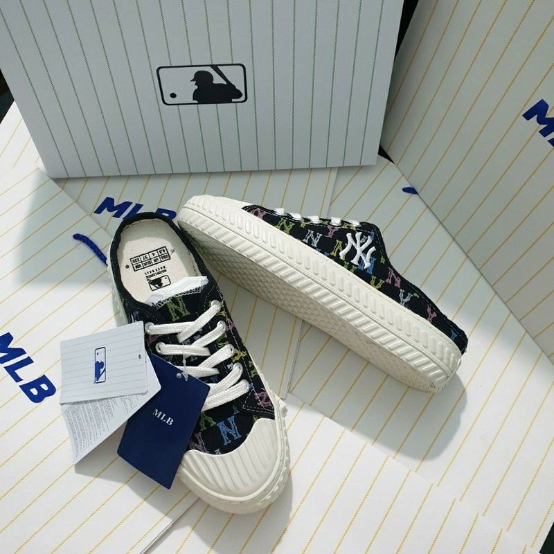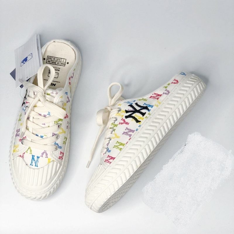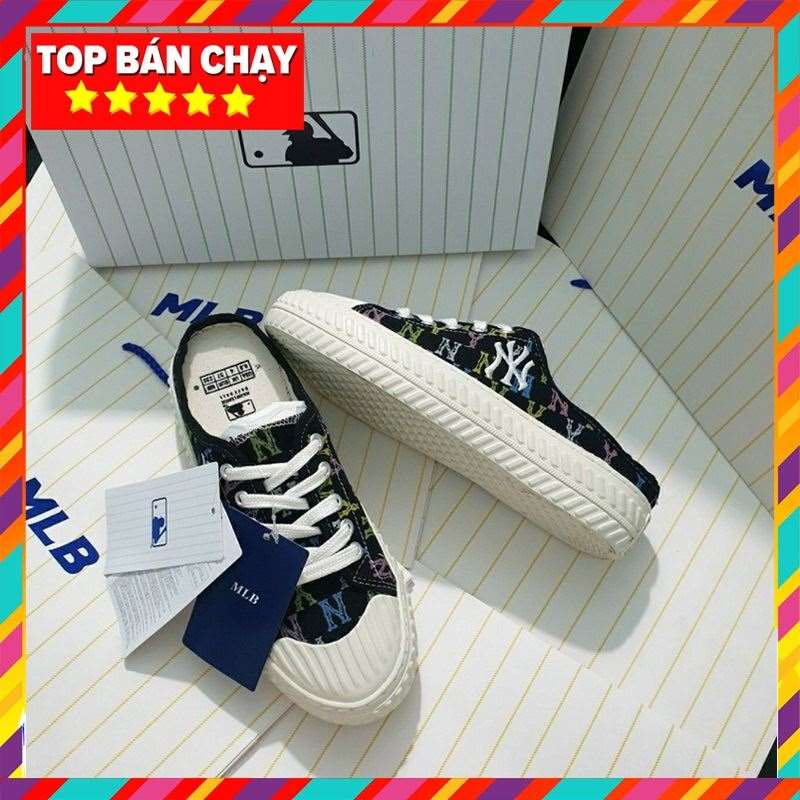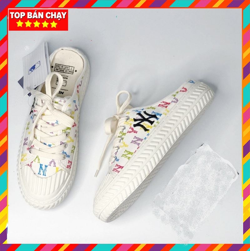 Giầy sục nữ – Sục mlb ny hoa văn cao cấp – Giày đạp gót 2 màu đen trắng