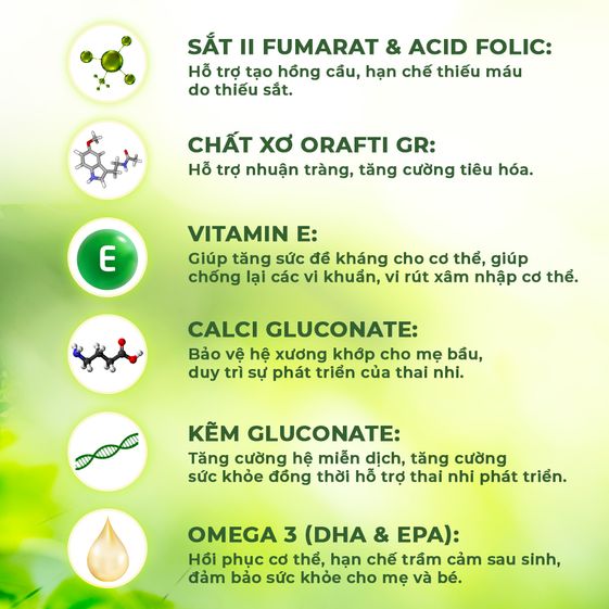 Thành phần: Dầu cá (Fish oil) (Tương đương DHA 60mg, EPA 90mg) – nhập khẩu từ Peru, Calci Gluconate, Kẽm Gluconate, Orafti GR (Insulin 95%, nhập khẩu Bỉ), Sắt II Fumarat, Magie Gluconate, Nicotinamide (Vitamin B3), Vitamin B5, Vitamin B6, Vitamin B1, Đồng Gluconate, Mangan Gluconate, Chromium Picolinate, Potassium iodide (Kali iotua), Acid Folic, Selenium yeast 2000PPM, Vitamin B12, Vitamin D3, Vitamin E; Phụ liệu: Dầu thực vật, glycerin, nipazil, lecithin, vỏ nang gelatin