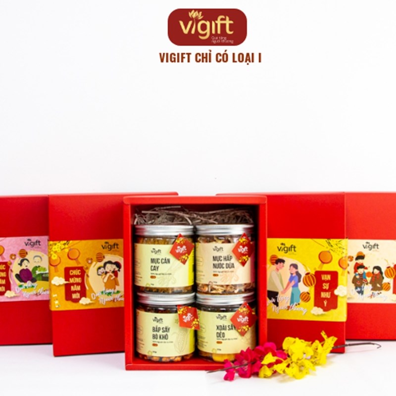 Hộp quà ViGift 4 An Nhiên bao gồm Xoài Sấy Dẻo 220g, Mực Cán Cay 150g, Mực Hấp Nước Dừa 150g và Bắp Sấy Bò Khô 200g