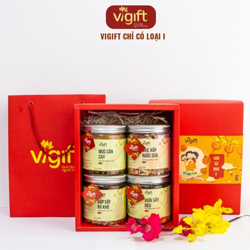 Hộp quà ViGift 4 An Nhiên bao gồm Xoài Sấy Dẻo 220g, Mực Cán Cay 150g, Mực Hấp Nước Dừa 150g và Bắp Sấy Bò Khô 200g