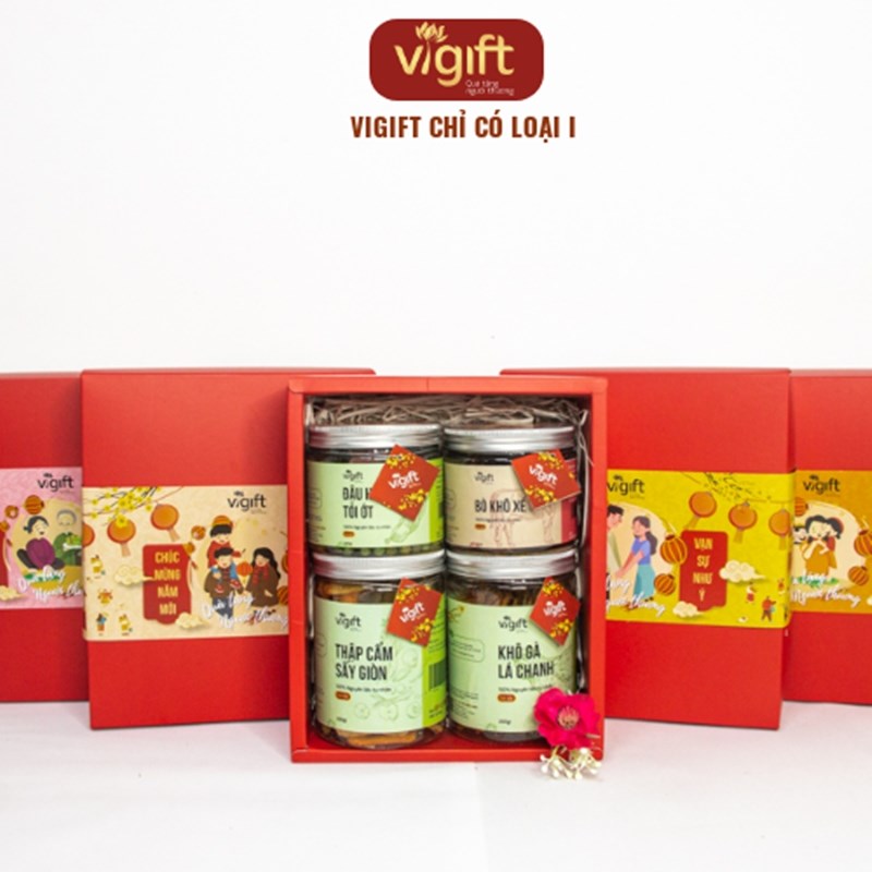 Hộp quà 4 Phúc Lộc ViGift bao gồm các món Thập Cẩm Sấy Giòn 200g, Khô Gà Lá Chanh 200g, Đậu Hà Lan Tỏi Ớt 200g và Khô Bò Xé 150g