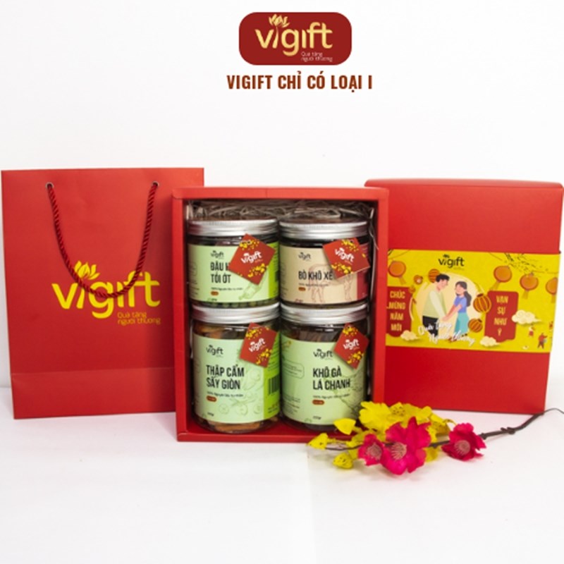 Hộp quà 4 Phúc Lộc ViGift bao gồm các món Thập Cẩm Sấy Giòn 200g, Khô Gà Lá Chanh 200g, Đậu Hà Lan Tỏi Ớt 200g và Khô Bò Xé 150g