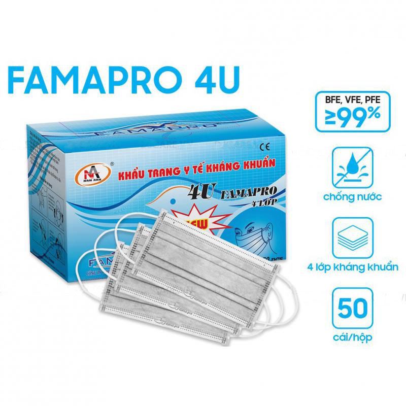 Khẩu trang y tế 4 lớp kháng khuẩn Famapro 4U Chống thẩm thấu chất lỏng, ngăn giọt bắn và lây lan dịch tể.