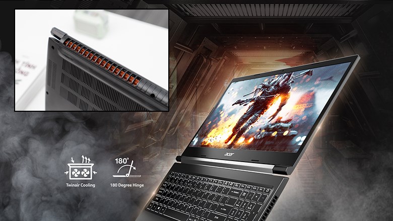 Laptop Acer Gaming Aspire A715-43G-R8GA được trang bị hệ thống tản nhiệt mạnh mẽ với hệ thống hai quạt tản nhiệt, 3 ống đồng fullsize, heatsink size lớn giúp tối ưu khả năng tản nhiệt, người dùng có thể vừa chơi game vừa làm việc ở bất cứ lúc nào. Bản lề thiết kế chắc chắn ít bị rung lắc khi chơi, có khả năng mở góc 180 độ giúp bảo vệ máy tốt hơn.