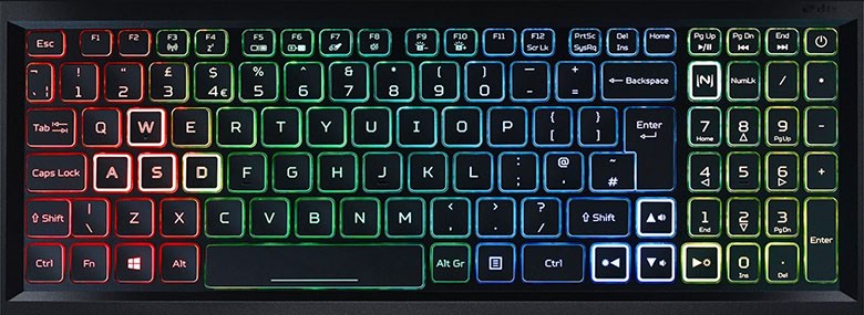 Acer Nitro AN515-57-71H1 trang bị bàn phím Fullsize với hành trình phím tối ưu, độ nảy, độ nhạy tốt. Đặc biệt, bàn phím còn được trang bị đèn nền RGB 4 vùng tùy chọn với các phím WASD, tăng thêm sự hứng khởi khi bạn đang ở trong cuộc chiến và giúp bạn dễ dàng gõ phím trong điều kiện thiếu ánh sáng, đêm tối. Bạn có thể tùy chỉnh hiệu ứng chuyển đổi màu sắc yêu thích thông qua phần mềm Nitro Senser cực tiện lợi.