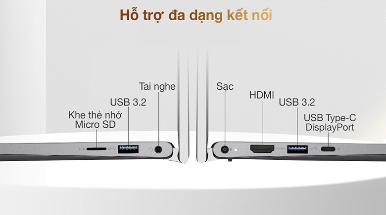 Laptop Dell Inspiron 5410 P147G002 70262927 được trang bị khá đầy đủ các cổng kết nối phổ biến hiện nay như: USB Type-C (Power Delivery and DisplayPort), 2 x USB 3.2, HDMI, Jack tai nghe 3.5 mm, khe thẻ nhớ Micro SD hỗ trợ liên kết dễ dàng tương thích với các thiết bị ngoại vi.