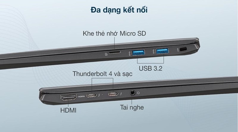 Mặc dù thiết kế nhỏ gọn nhưng laptop LG Gram 16 2021 16Z90P – G.AH73A5 chính hãng được trang bị đầy đủ các cổng kết nối. Trong đó bao gồm 2 cổng USB 3.2, 2 cổng USB-C Thunderbolt 4, 1 cổng HDMI và 1 cổng HP-Out. Bạn có thể dễ dàng kết nối hoặc chuyển dữ liệu với các thiết bị khác một cách ổn định nhất.