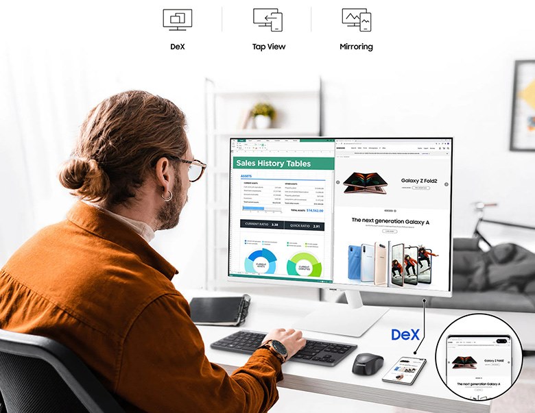 Thoải mái sử dụng các ứng dụng di động khi kết nối màn hình với điện thoại nhờ ứng dụng kết nối không dây DeX. Bạn có thể tham dự các cuộc họp trực tuyến, lướt web hay đọc tài liệu mượt mà như đang sử dụng trên máy tính. Hơn nữa, với tính năng Tap View bạn chỉ cần chạm nhẹ điện thoại vào màn hình máy tính thiết bị nhanh chóng kết nối và trình chiếu nội dung từ điện thoại lên màn hình cho phép bạn thưởng thức hình ảnh hoặc bộ phim yêu thích ngay trên màn hình lớn.