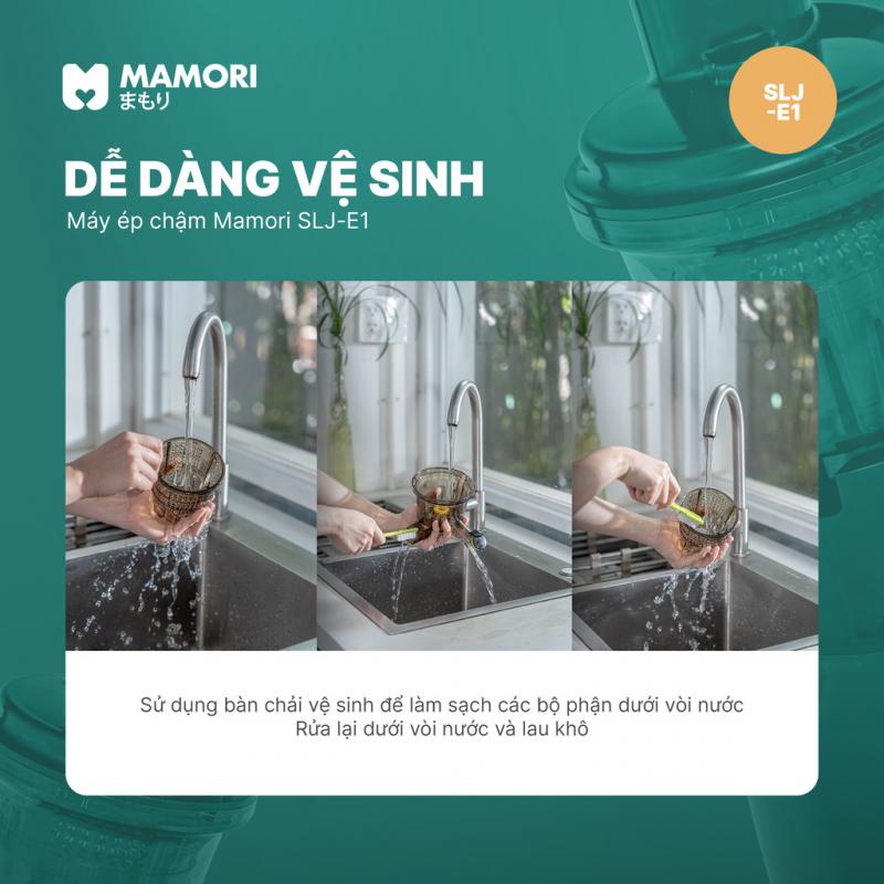 Máy ép chậm Mamori SLJ-E1 không dùng lưỡi dao mà dùng trục vít từ từ đưa hoa quả vào, quá trình ép gần như không tạo ra lực ly tâm và ma sát, giúp giữ lại lượng vitamin trong hoa quả cao gấp 6 lần, lượng nước ép nhiều hơn và lượng bã chỉ bằng 1/3 so với các máy ép thông thường, nước ép cũng không bị tách nước và hạn chế tạo bọt.
