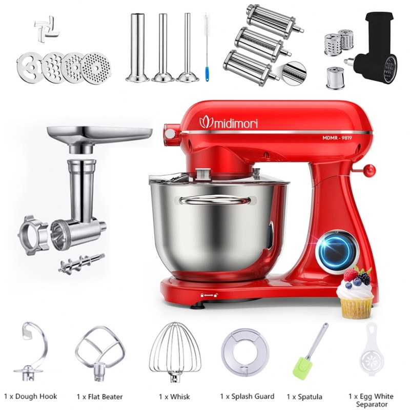 MDMR-9819 có các chức năng chính: Trộn bột, xay thịt, đùn xúc xích, cán mỳ sợi, bào cắt rau củ quả.