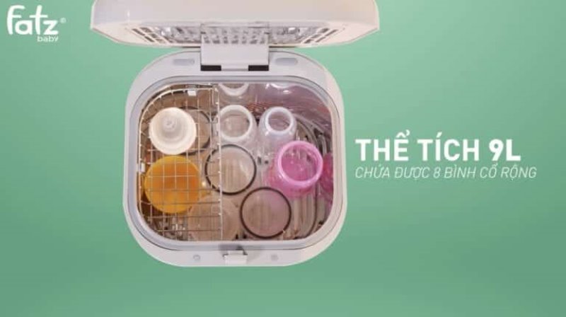 – Thể tích 9 L có thể chứa 8 bình cổ rộng: Với thể tích này mẹ sẽ không còn phải lo lắng khi qúa nhiều vật dụng cần tiệt trùng cùng một lúc, đôi lúc 1 con gấu bông cũng có thể để vưà trong máy tiệt trùng.