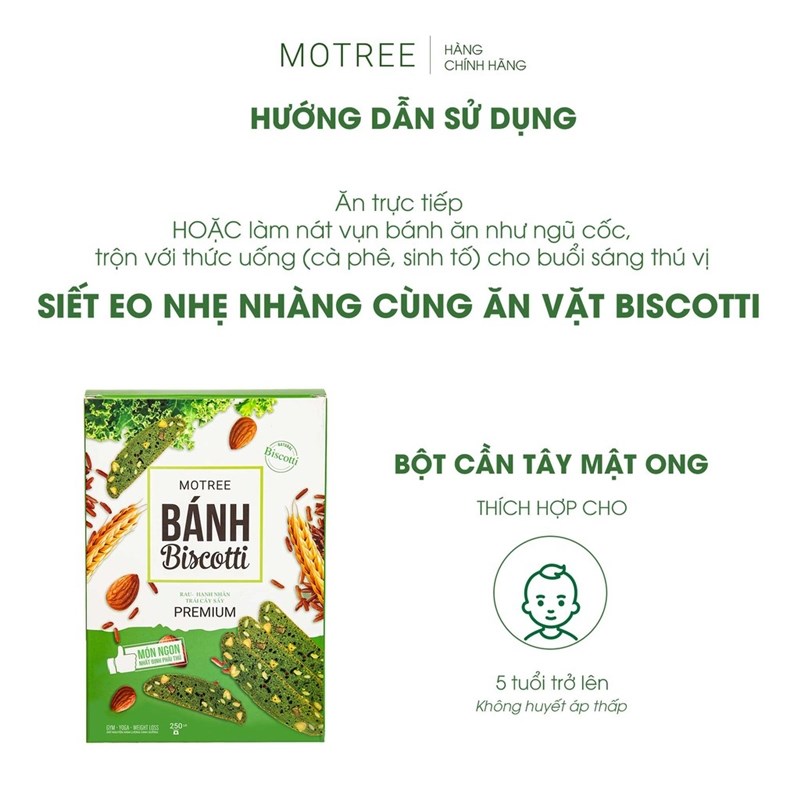 Đối với những người đang trong chế độ giảm cân, các loại thực phẩm nạp vào cơ thể cần phải đặc biệt chú trọng. Thông thường, những sản phẩm healthy an toàn nhưng vẫn bổ sung đủ dinh dưỡng được ưa chuộng hơn hẳn. Trong số rất nhiều thương hiệu trên thị trường hiện nay, bánh ăn kiêng giảm cân Motree Biscotti 250g bổ sung dinh dưỡng và vitamin được nhiều người dùng yêu thích. Bánh mang hương vị tự nhiên, không đường, không tinh bột trắng hay chất bảo quản. Chỉ với 2 miếng bánh có thể thay thế cho bữa ăn sáng, hỗ trợ siết eo theo chế độ ăn kiêng hợp lý. Cách sử dụng vô cùng đơn giản, bạn có thể ăn trực tiếp hoặc làm vụn và dùng chung với sữa như ngũ cốc. Các thành phần an toàn, tự nhiên, thân thiện với sức khỏe. Việc giảm cân, siết cân của bạn sẽ thêm nhẹ nhàng và an toàn hơn với bánh Motree Biscotti.