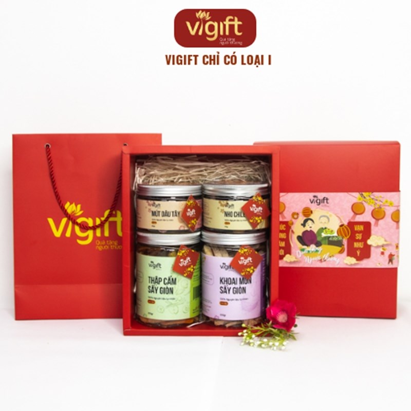 Hộp quà 4 Phát Tài ViGift bao gồm các món Khoai Môn Sấy Giòn 200g, Thập Cẩm Sấy Giòn 200g, Mứt Dâu Tây 200g và Nho chile 3 Màu 170g