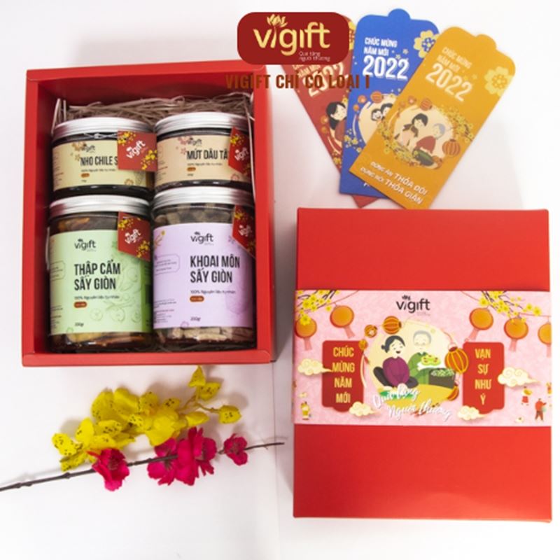 Hộp quà 4 Phát Tài ViGift bao gồm các món Khoai Môn Sấy Giòn 200g, Thập Cẩm Sấy Giòn 200g, Mứt Dâu Tây 200g và Nho chile 3 Màu 170g