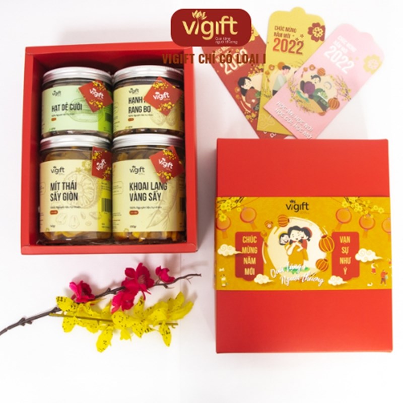 Hộp quà ViGift 4 Sức Khoẻ bao gồm các món Mít Thái Sấy Giòn 200g, Khoai Lang Vàng Sấy Giòn 200g, Hạt Dẻ Cười Sấy 200g và Hạnh Nhân Rang Bơ 200g