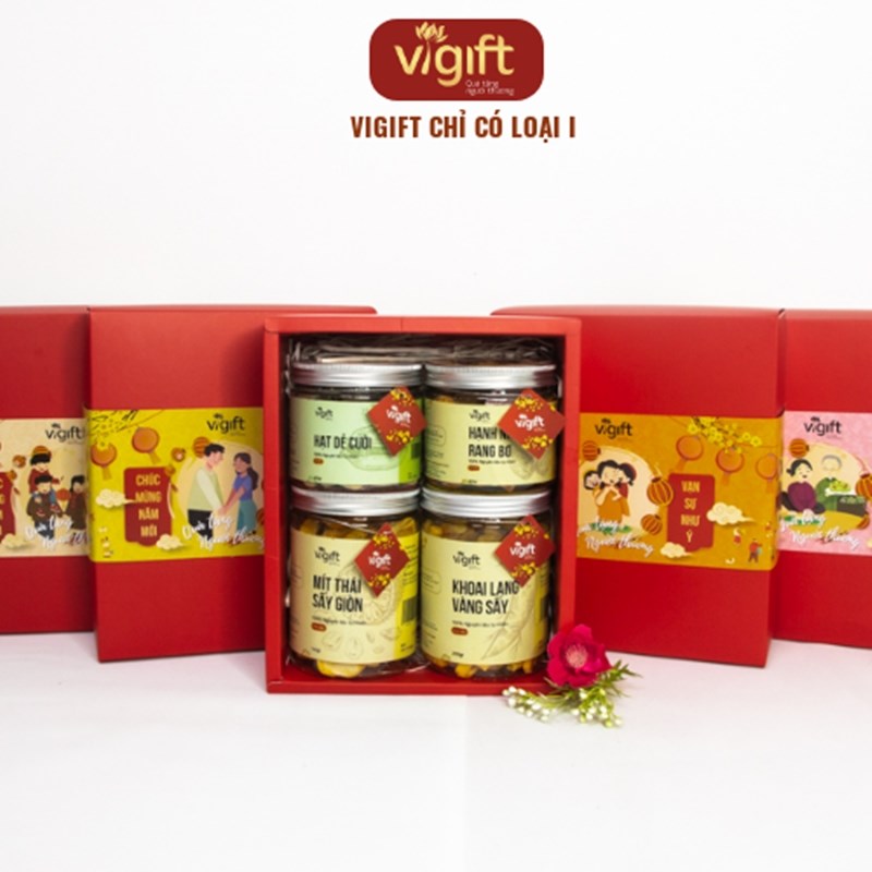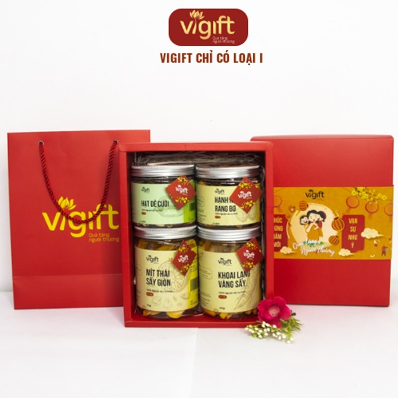 Hộp quà ViGift 4 Sức Khoẻ bao gồm các món Mít Thái Sấy Giòn 200g, Khoai Lang Vàng Sấy Giòn 200g, Hạt Dẻ Cười Sấy 200g và Hạnh Nhân Rang Bơ 200g