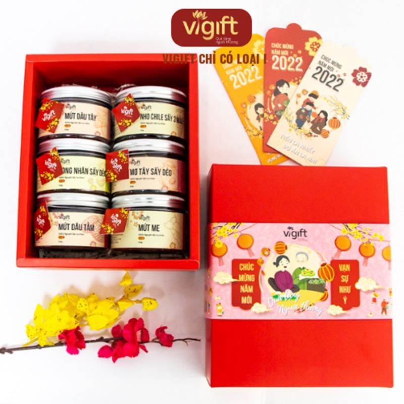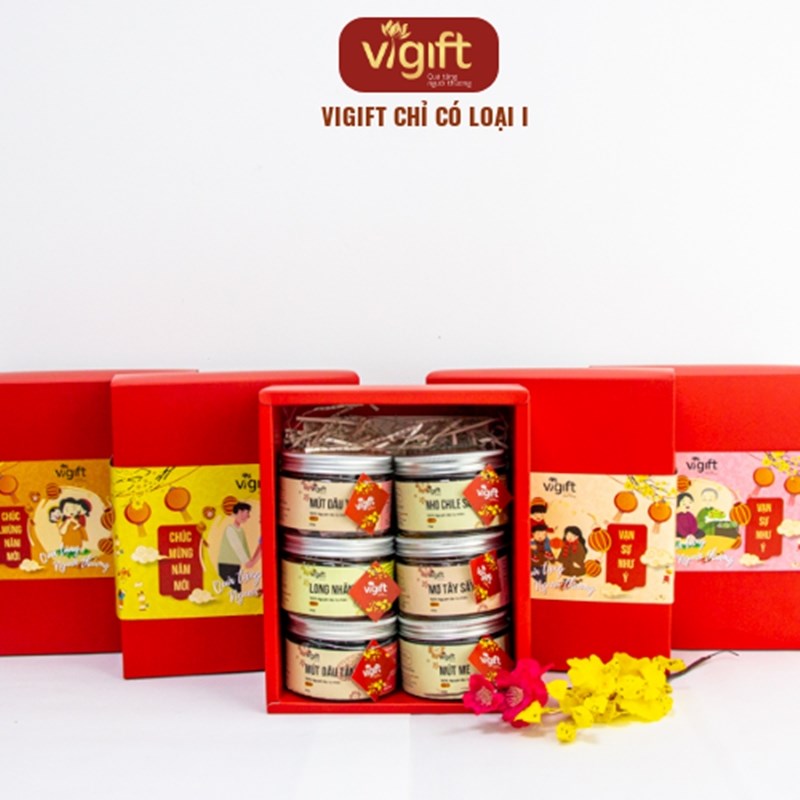 Hộp quà ViGift 6 Cát Tường bao gồm các món Mứt Me 200g, Mứt Dâu Tây 200g, Mứt Dâu Tằm 200g, Long Nhãn Sấy Dẻo 150g, Nho Chile 3 Màu 170g và Mơ Sấy Dẻo 200g