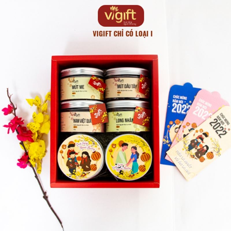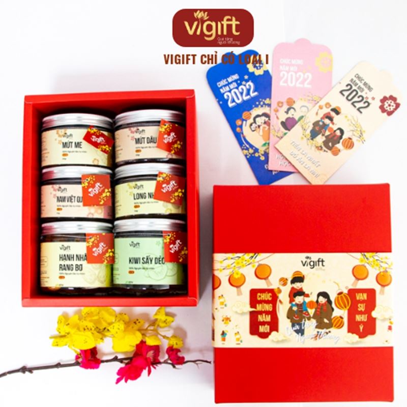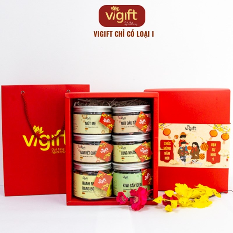 Hộp quà ViGift 6 Tình Duyên bao gồm các món Mứt Me 200g, Long Nhãn Sấy Dẻo 150g, Mứt Dâu Tây 200g, Nam Việt Quất Sấy Dẻo 170g, Kiwi Sấy Dẻo 200g và Hạnh Nhân Rang Bơ 200g