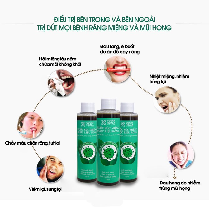 – Sát khuẩn, diệt nấm, kháng vi rút gây bệnh trong khoang miệng và niêm mạc họng bằng các thảo mộc thiên nhiên an toàn và lành tính, ngăn ngừa các bệnh răng miệng và bệnh nhiễm trùng đường hô hấp