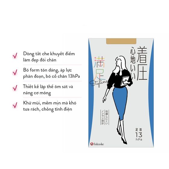 Độ bó phân đoạn tinh tế theo các vùng đùi (5hPa) – bụng chân (8hPa) – cổ chân (13hPa) phù hợp với từng phần cơ thể, tạo cảm giác dễ chịu khi mang tất.