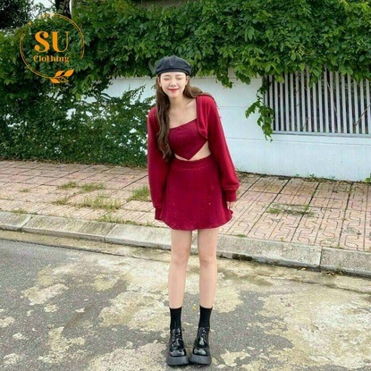 Tên sản phẩm: Set 3 Món Áo Dây Crop Mix Chân Váy Xòe Kèm Áo Khoác – Su Clothing