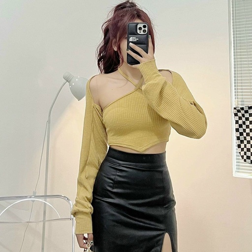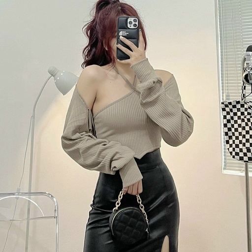 Set áo đôi gồm áo kiểu cổ yếm nhọn tà croptop trơn + khoác ngoài tay dài bắt mắt.