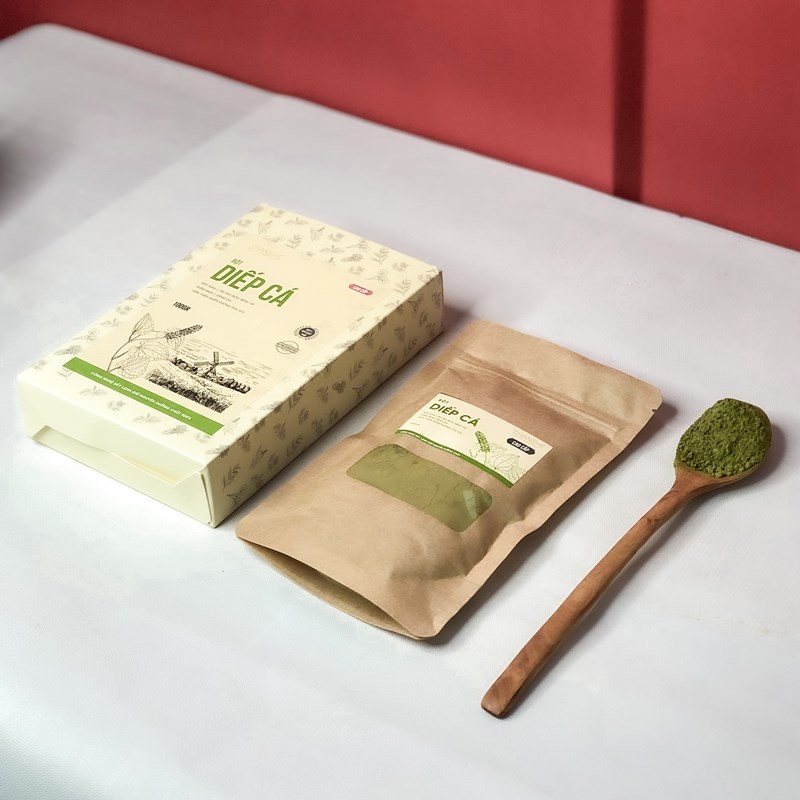 Bột diếp cá nguyên chất được chế biến từ những lá rau diếp cá xanh nuôi trồng sạch sẽ tại nông trại, được kiểm định nghiêm ngặt từ các rau nuôi trồng cho đến sấy lạnh và xay mịn.