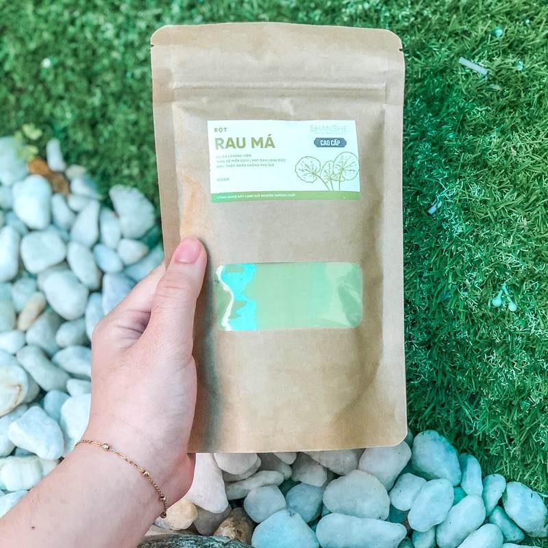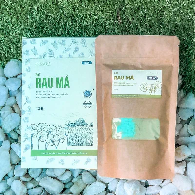 Shanshe Bột rau má 100g Bột rau má nguyên chất được chế biến từ những lá rau má tươi nuôi trồng sạch sẽ tại nông trại, được kiểm định nghiêm ngặt từ các rau nuôi trồng cho đến sấy lạnh và xay mịn. Có tác dụng cho người uống dịu da, kháng viêm, tăng cường hệ miễn dịch, mát gan thải độc.