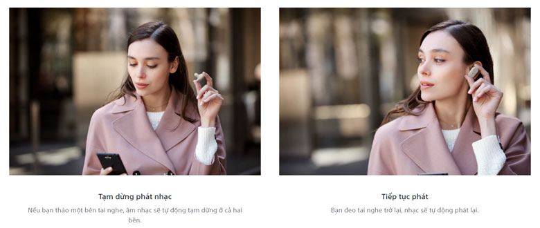 – Khi tháo 1 bên tai nghe: nhạc sẽ tự động dừng lại ở cả hai tai nghe và sẽ tự động phát trở lại khi đeo vào.