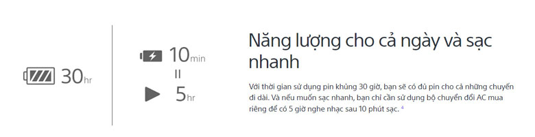 Đồng thời tai nghe cũng được trang bị tính năng sạc nhanh, chỉ 10 phút sạc và bạn đã có 5h nghe nhạc sau đó. Tuy nhiên, bạn cần sử dụng bộ chuyển đổi AC để sử dụng tính năng sạc nhanh này.