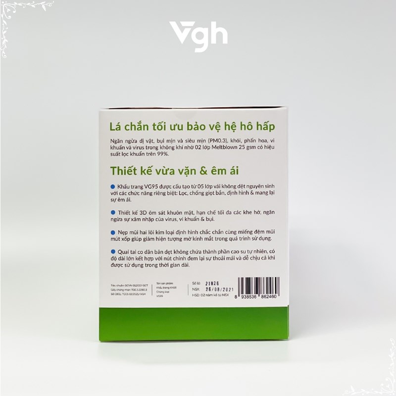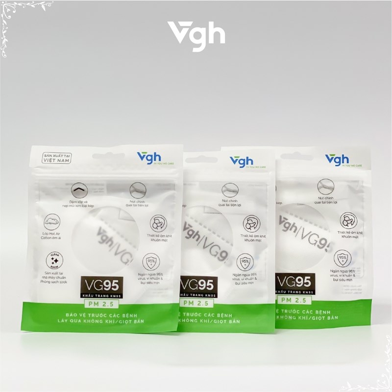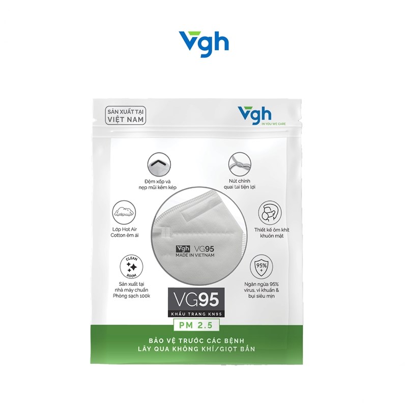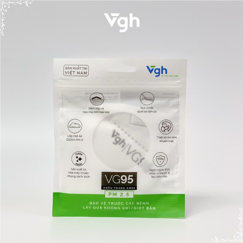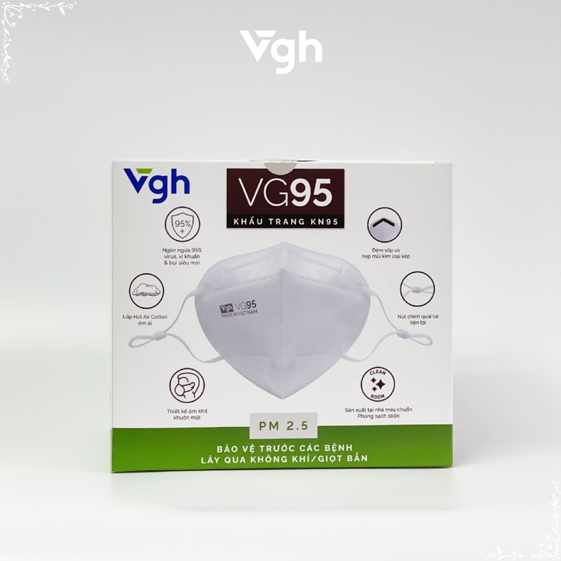 Trong bối cảnh dịch bệnh COVID 19 vẫn còn đang có những diến biến phức tập, khẩu trang đã và đang là vật bất ly thân của mỗi người. Bên cạnh đó. đeo khẩu trang cũng là bí quyết bảo vệ sức khỏe bản thân trước những yếu tố gây dị ứng theo mùa hay các bệnh lây qua đường hô hấp khác như lao phổi, cúm, bệnh hô hấp ở trẻ do RVS gây ra. Ở Việt Nam, khoảng 60.000 người chết mỗi năm có liên quan đến ô nhiễm không khí (Theo số liệu của Tổ chức Y tế Thế giới WHO). Sử dụng khẩu trang VG95 với lớp Meltblown cao cấp sẽ bảo vệ bạn trước bụi mịn PM 2.5, siêu bụi mịnh PM0.3 và các tác nhân gây hại trong không khí một cách dễ dàng, hiệu quả. VG95 được thiết kế tối ưu với quai tai mềm mại và nẹp mũi định hình 02 lõi kim loại chắc chắn, mang đến cảm giác dễ chịu & thoải mái cho người sử dụng.