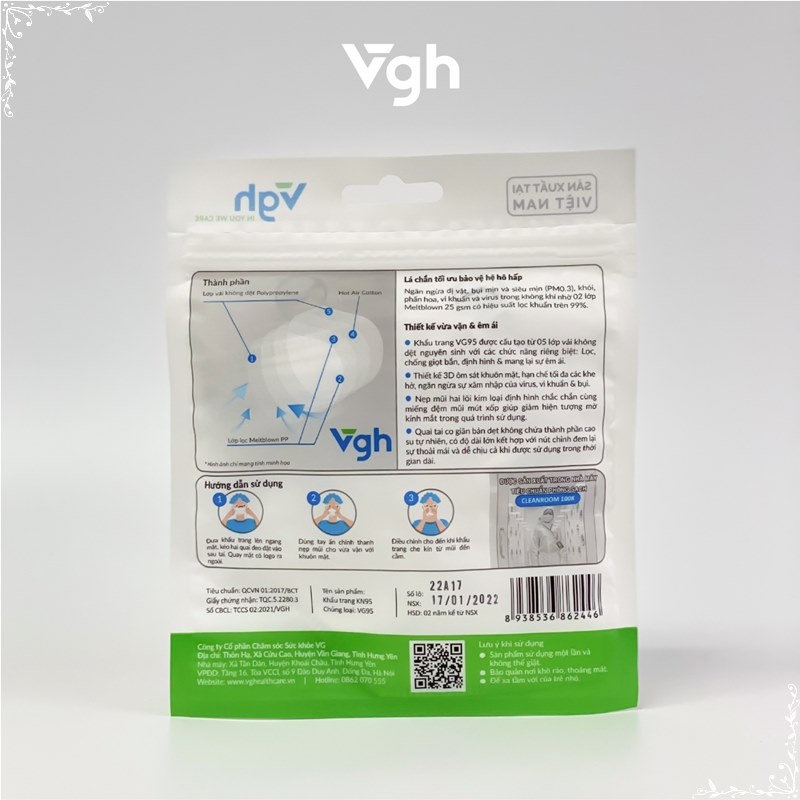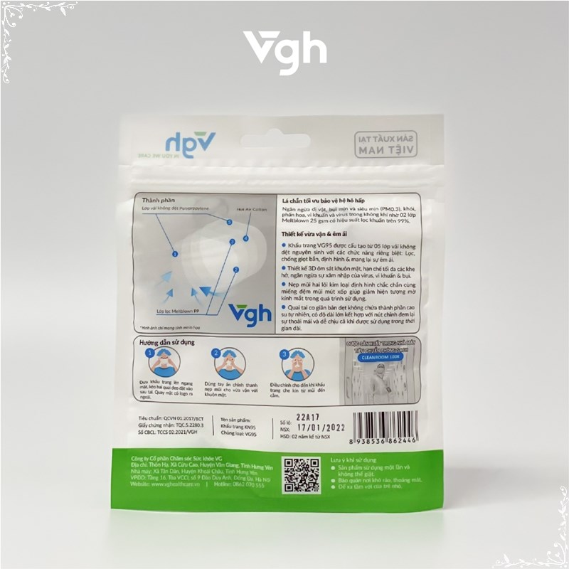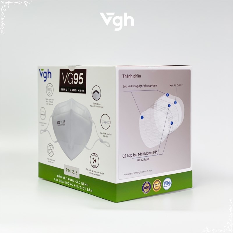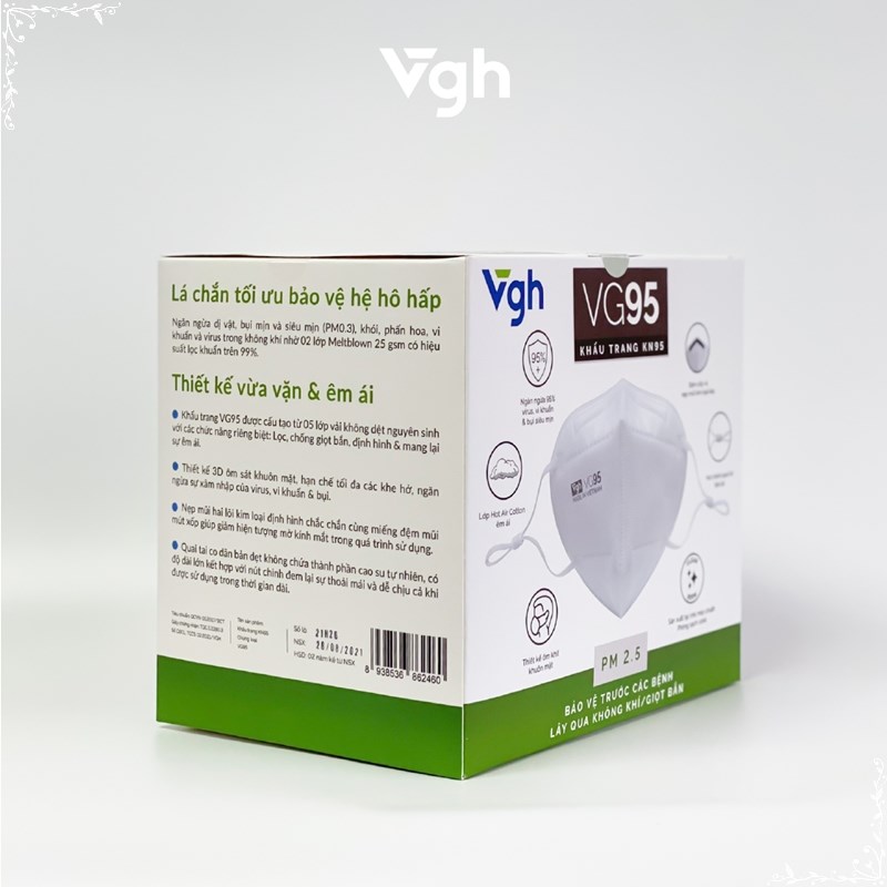 Khẩu trang VG95 5 lớp giúp lọc cản virus, vi khuẩn, bụi mịn, thiết kế 3D ôm khít khuôn mặt, giúp hạn chế lem son và mỹ phẩm – Sản phẩm đã được chứng nhận đạt tiêu chuẩn N95 theo NIOSH (Mỹ) và FFP2 theo tiêu chuẩn châu Âu EN149